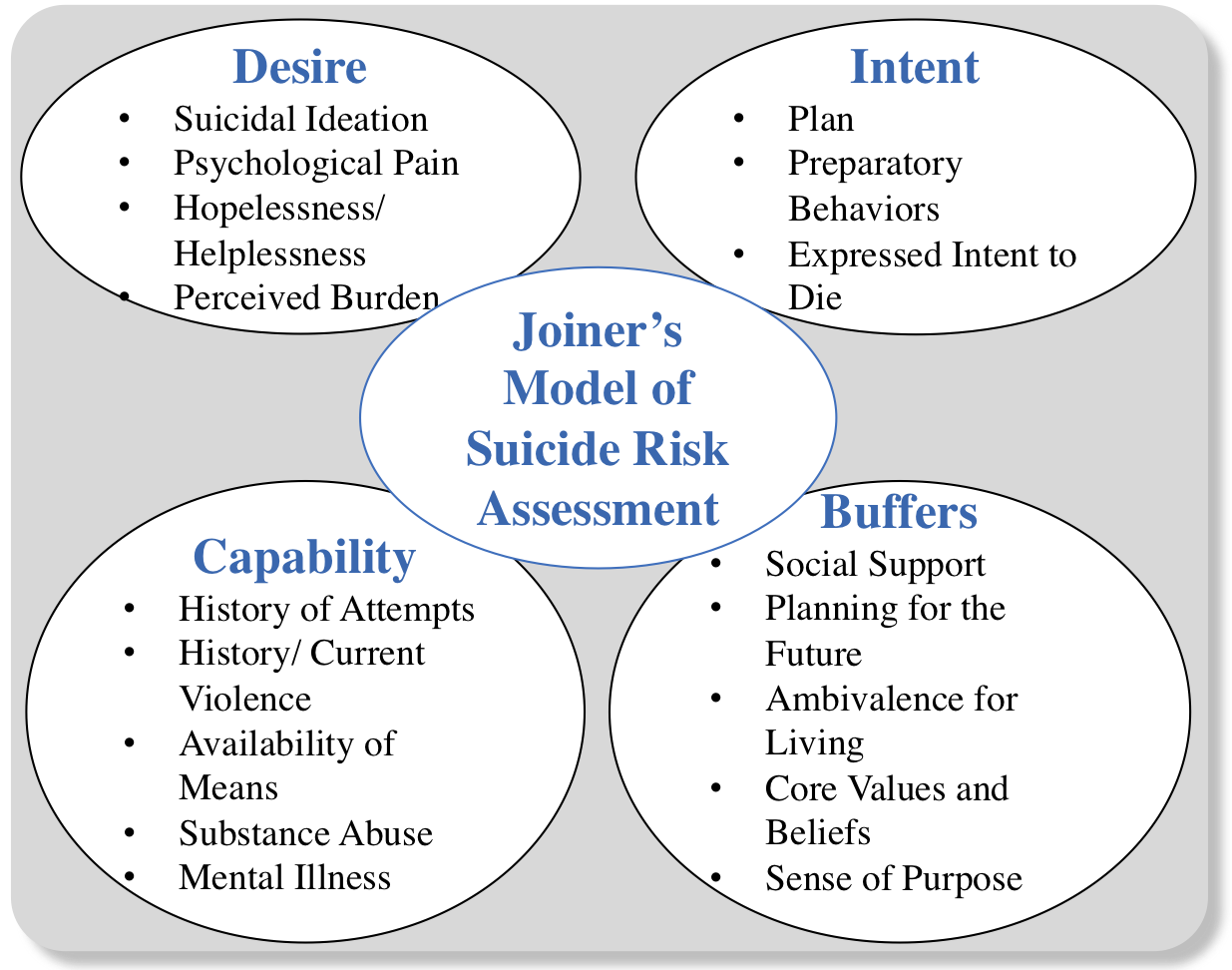 The Suicide Risk Assessment Scale assesses an individual on their level of desire, intent, capability, and protective factors, based on the research by Joiner et al. (2007).
