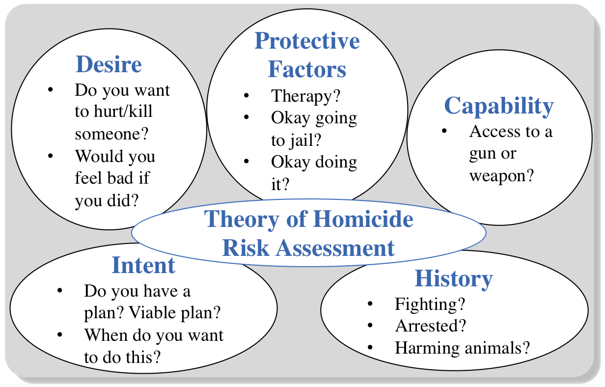The scale looks at an individual’s risk of acting on homicidal ideation through a rating scale of desire, intent, capability, history, along with protective factors, modeled after the Suicide Risk Assessment Scale.