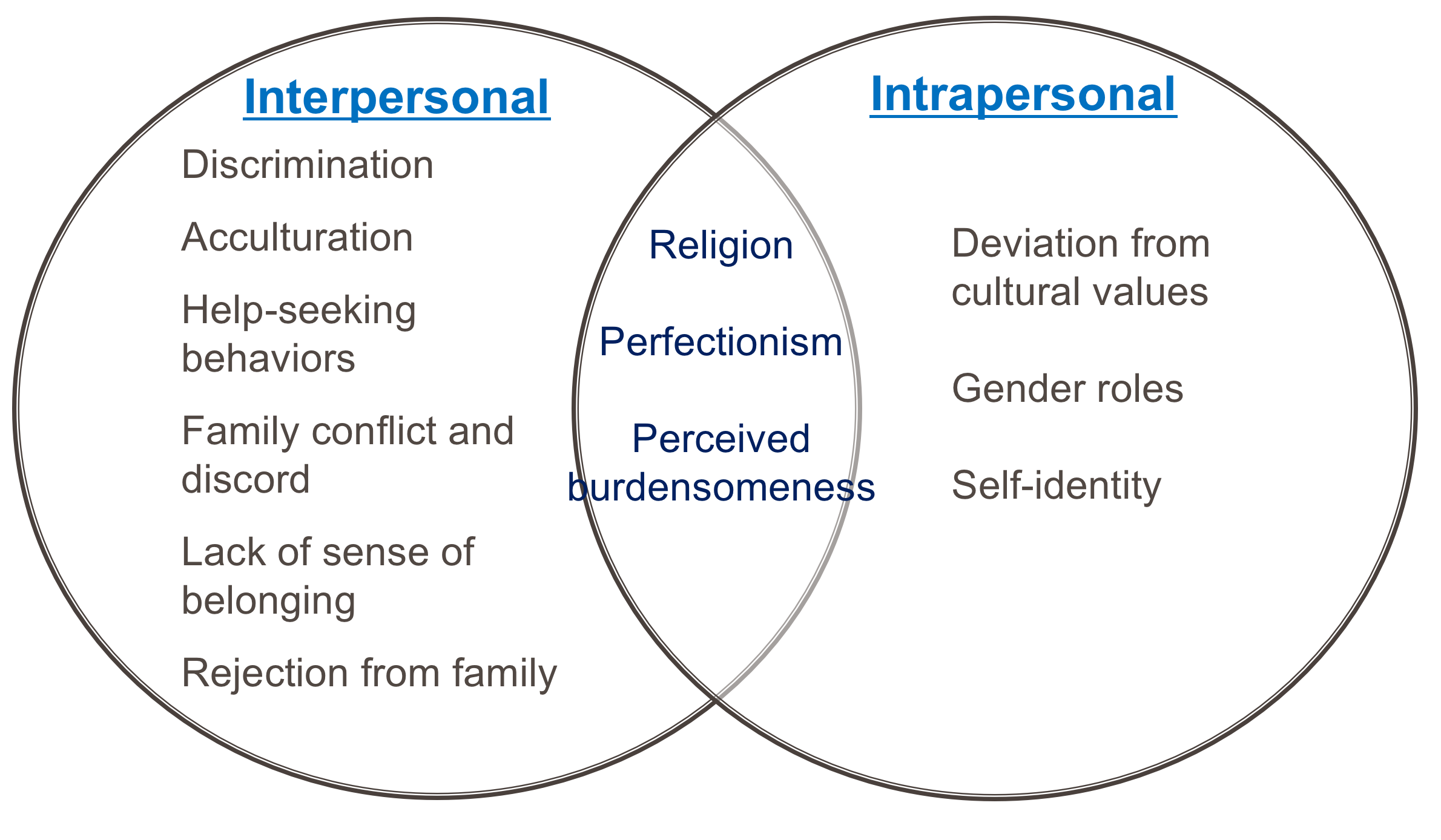 In suicide assessments of European American, Asian American, and Hispanic American adolescents, a relationship exists between suicide risk and protective factors related to the family system. Specifically, research on European American adolescent suicide assessment more frequently identifies the family as a protective factor. In contrast, research involving Asian American adolescents more frequently identifies family rejection and the pressure to keep suicidal ideation secret from others. Furthermore, a lack of a sense of belonging, perceived burdensomeness, and perfectionism were found more frequently in Asian American and Hispanic American adolescents compared to their European American peers.